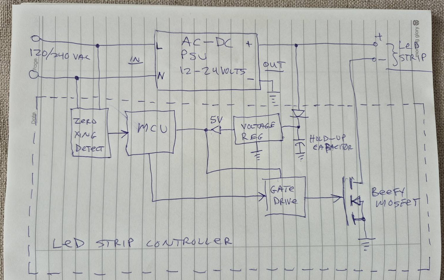 An isolated zero-crossing detector monitors the state of the incoming AC line, when it detects a voltage drop-out, it changes to the next state. The PSU’s internal capacitors and the hold-up capacitor should keep the board alive for at least 3-4 seconds after the power fails.